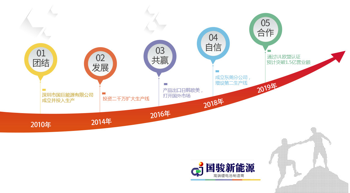 广东国骏新能源有限公司,坐落于美丽的海滨城市,现有员工500余人,主要产品为聚合物锂离子电池,高倍率电池,大动力电池以及移动电源等,所有产品均拥有自主知识产权,并取得多项锂离子电池技术发明及实用新型专利。公司采用先进的自动化生产设备,引进成熟的电池生产工艺, 并以雄厚的经济实力为支撑,迅速占领国内外数码电脑,无线移动设备和野外照明作业设备,以及随身便携电子产品,航模,电动车,电动工具等消费类电子和电工电气市场。现有成熟型号1000多种,日产能超过15W只。